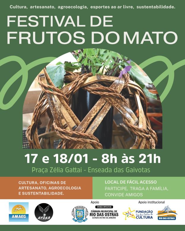 Um café agroecológico, marcado para as 9h do sábado, abre o Festival Frutos do Mato, seguido por palestras sobre o uso de materiais naturais no artesanato e a relevância do Geoparque Costões e Lagunas. Na parte da tarde, o público poderá participar de oficinas de cerâmica e de confecção de colares de sementes. O encerramento do dia contará com apresentações culturais, incluindo um tributo a Dorival Caymmi e o projeto Canta, Canta Minha Gente, a partir das 18h.